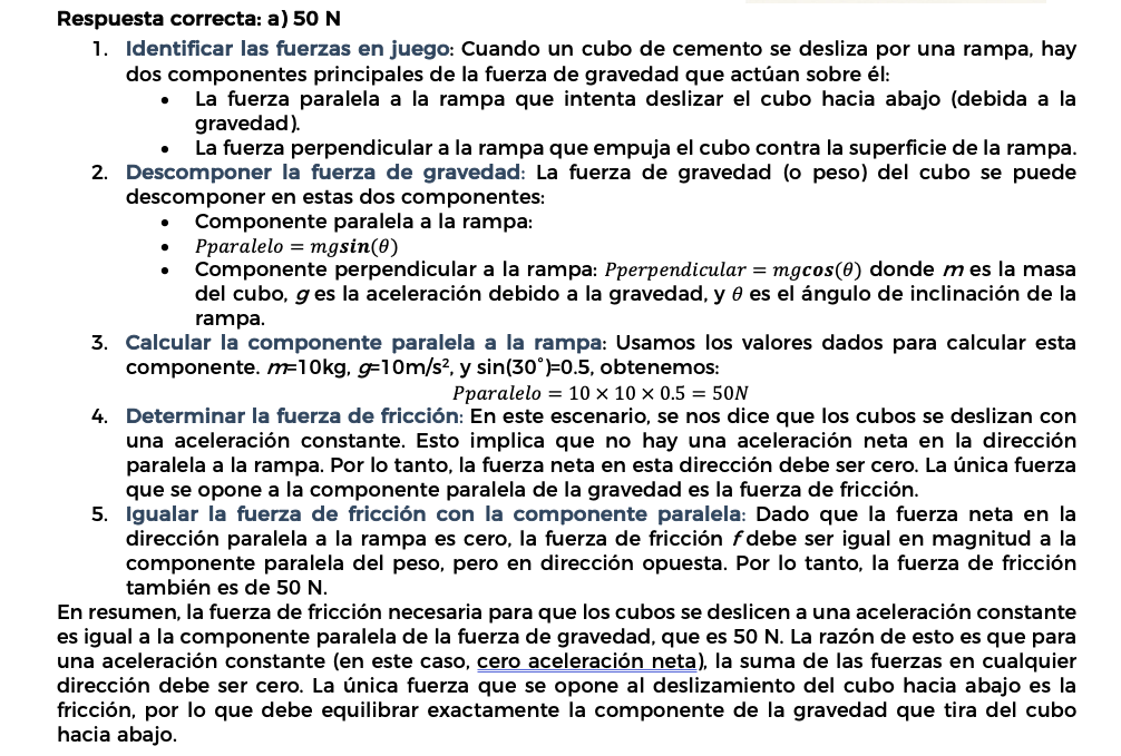 1. Se improvisa el montaje de una rampa metálica para bajar cubos de cemento de 10 kg por acción de la fuerza de gravedad. Si la inclinación de dicha rampa es de 30°, ¿cuál es la fuerza de fricción que logra que los cubos se deslicen a una aceleración constante? Considere g=10 ms2 , sen 30° = 0.5, cos 30° = 0.87 y tan 30° =0.58.