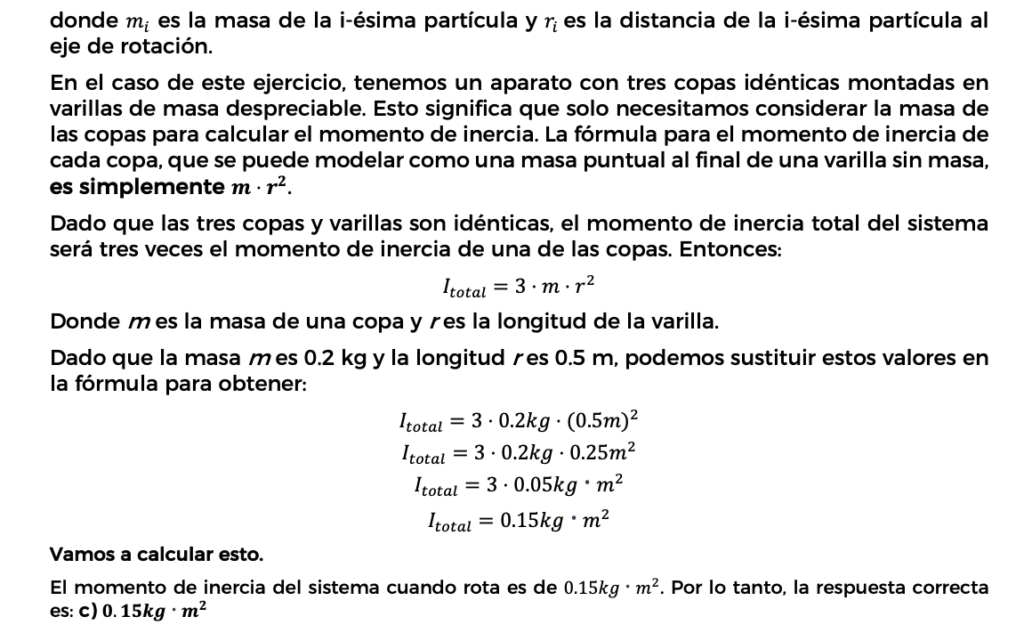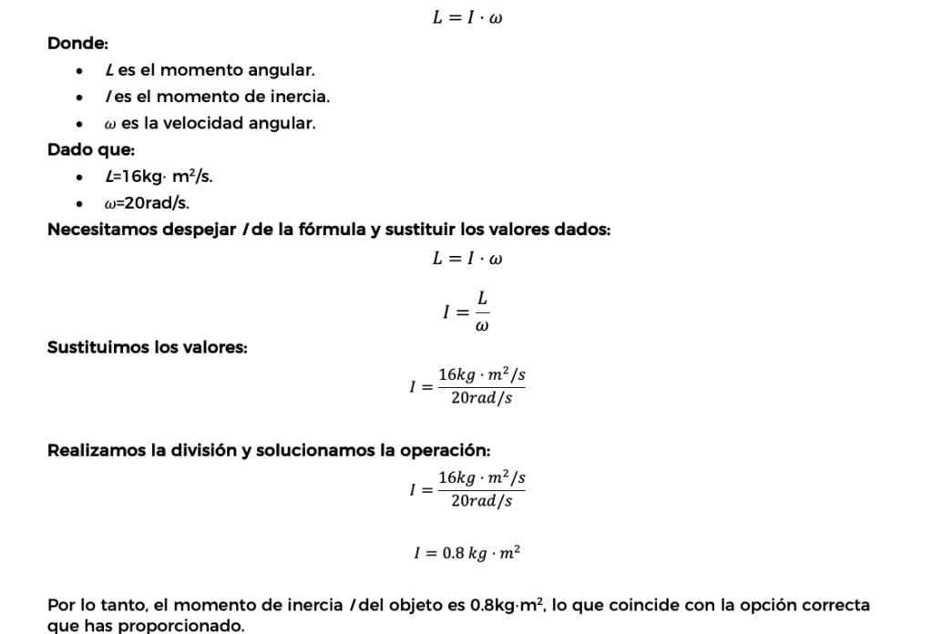 Para resolver este problema, vamos a calcular el momento de inercia I de un objeto que gira. Utilizaremos la relación entre el momento angular L y el momento de inercia I, dada por la fórmula: