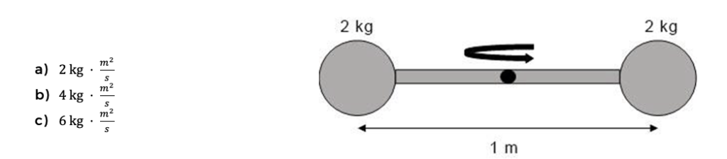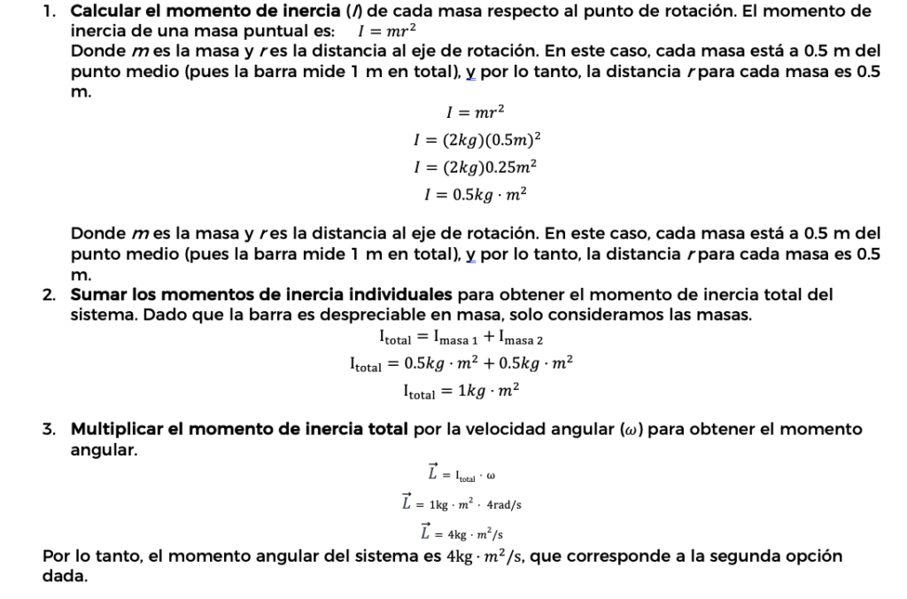 7. Se tienen 2 masas unidas como se muestra en la figura. Si el sistema gira en torno al punto medio de la barra con una velocidad angular de 4 rads y la masa de la barra es despreciable, ¿cuál es el momento angular de las masas?