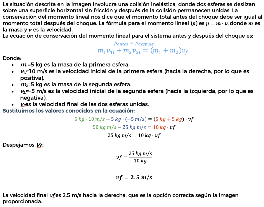 9. Sobre una superficie horizontal 2 esferas sólidas se deslizan sin fricción, de forma colineal. La primera se desplaza hacia la derecha a 10 m/s y su masa es de m1 = 5 kg. La segunda se desplaza hacia la izquierda a 5 m/s y su masa es de m2 = 5 kg. Si al colisionar ambas esferas se mantienen unidas, ¿cuál es la velocidad final después del choque? Considere el movimiento a la derecha como positivo y a la izquierda como negativo.