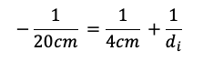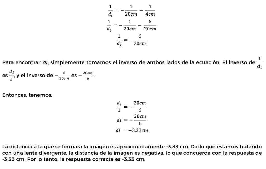 - f es la distancia focal de la lente (en este caso, 20 cm, pero recuerda que la distancia focal de una lente divergente es negativa).