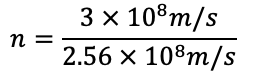 21. Determine el índice de refracción de una sustancia cuando la velocidad de la luz en ella es de 2.56 x 108 m/s. Considere la velocidad de la luz en el vacío c = 3 x 108 m/s.