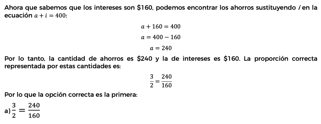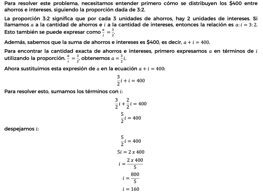 1. Si una persona tiene en el banco un saldo de $400, de los cuales una parte son ahorros y los otros intereses en una razón de 3:2, ¿cuál es la proporción representada?