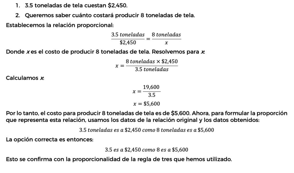 Para resolver este problema, usaremos la regla de tres simple para encontrar la cantidad de dinero que se necesita para producir 8 toneladas de tela, basándonos en la relación proporcionada: producir 3.5 toneladas de tela cuesta $2,450.