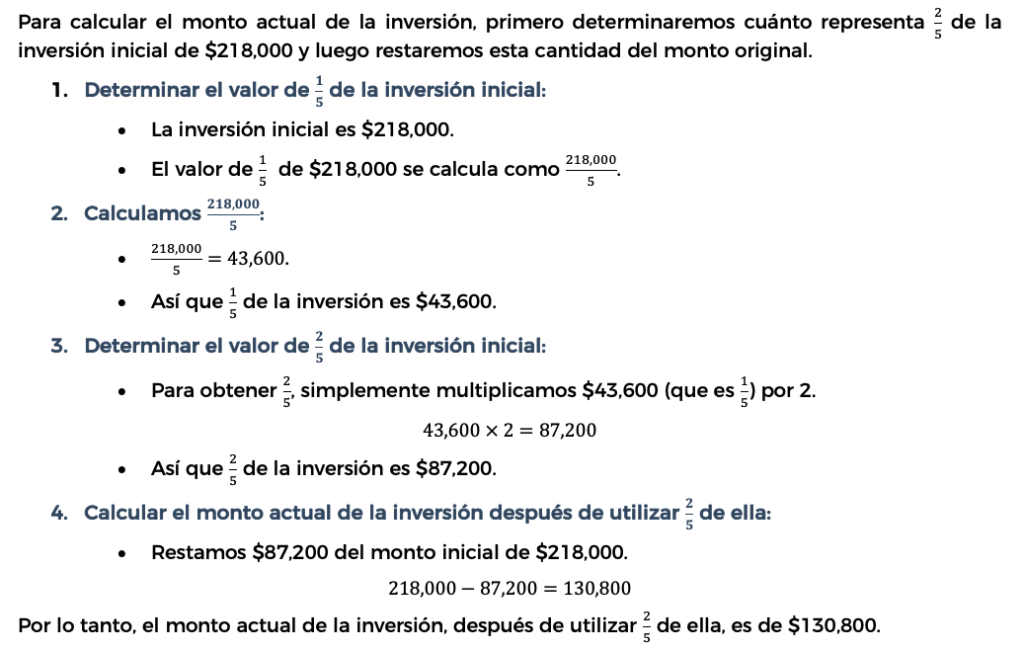 4. Calcule el monto actual de la inversión de una persona si al inicio tenía $218,000 y ha utilizado de la misma.