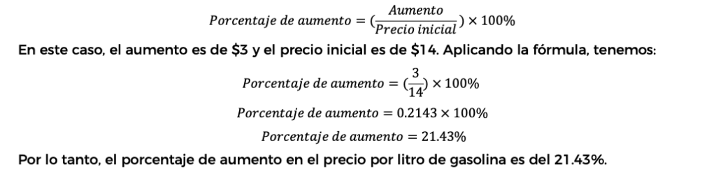 Para calcular el porcentaje de aumento en el precio por litro de gasolina, seguimos el procedimiento que mencionas. Se divide el aumento en el precio, que es de $3, entre el precio inicial, que es de $14, y luego se multiplica el resultado por 100% para obtener el porcentaje. La fórmula es la siguiente:
