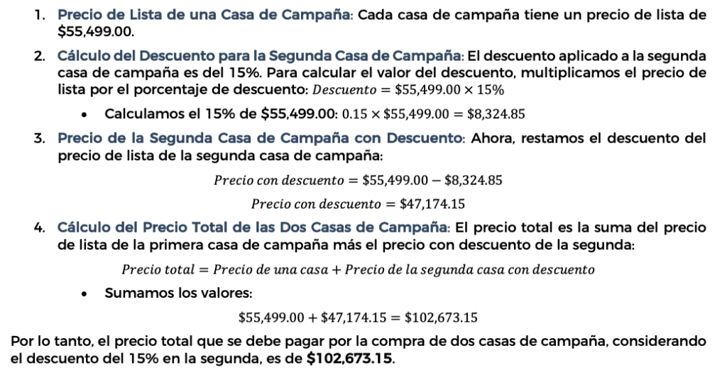 Para resolver este problema, debemos calcular el precio total de la compra de dos casas de campaña, teniendo en cuenta la oferta que indica que al comprar dos, la segunda tiene un descuento del 15%. Vamos a desglosar el cálculo paso a paso: