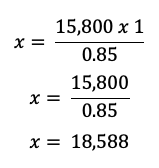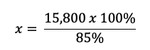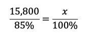 Sabemos que el $15,800 es el 85% del costo original, porque este es el precio después de aplicar un descuento del 15%. Usamos la regla de tres simple. Si $15,800 corresponde al 85%, ¿cuánto corresponderá al 100%? La ecuación sería: