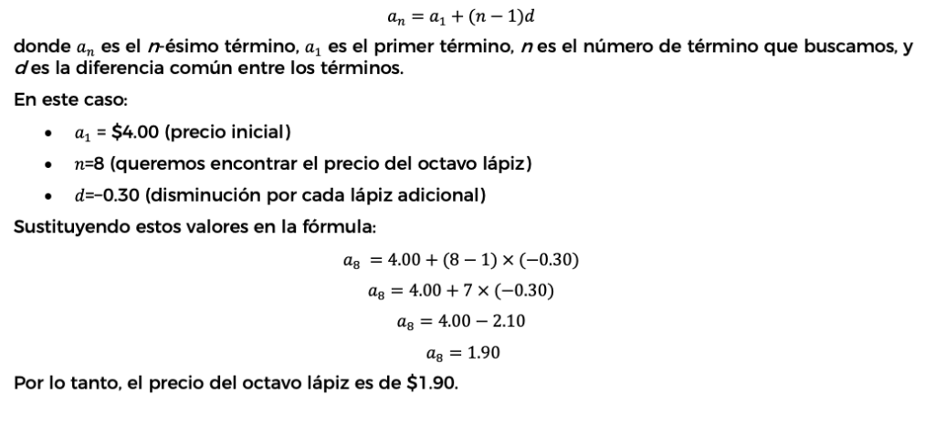 Para calcular el precio del octavo lápiz, utilizaremos la fórmula para encontrar un término específico en una sucesión aritmética. Sabemos que el precio inicial es de $4.00 y que por cada lápiz adicional, el precio disminuye en 30 centavos ($0.30). Esto forma una sucesión aritmética donde cada término es el precio del lápiz correspondiente.