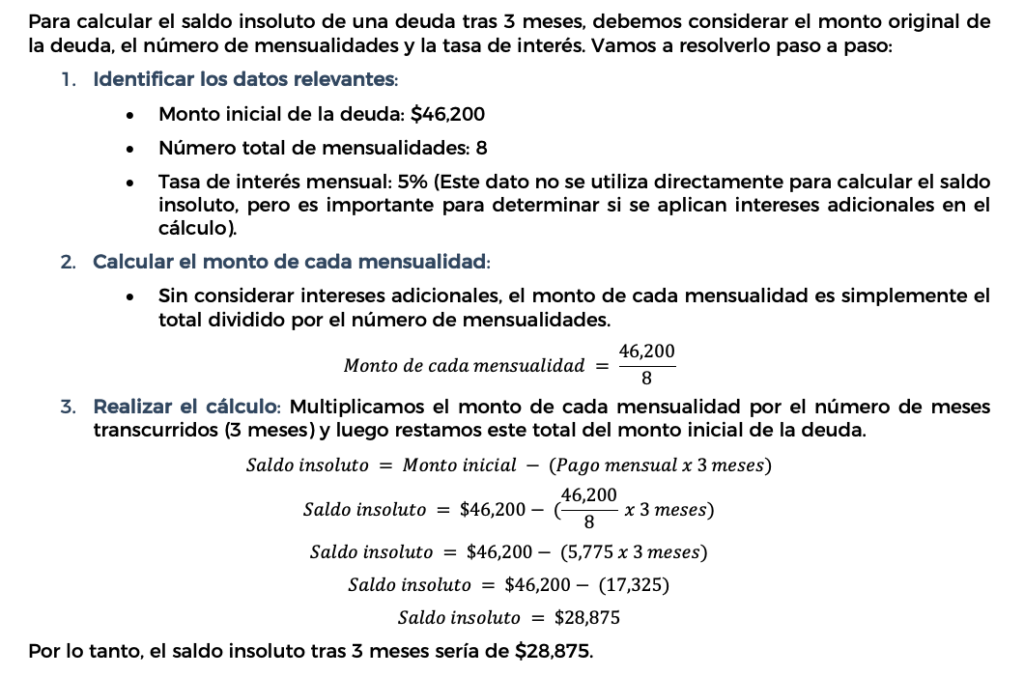 El saldo insoluto es la cantidad que queda pendiente de pagar en un préstamo después de realizar un pago. En este caso, cada mes se amortiza una parte del capital y se pagan intereses. Para resolver este problema debemos: