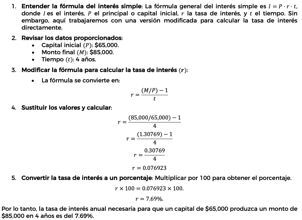 17. ¿A qué tasa de interés anual un capital de $65,000 invertido en una cuenta bancaria produce un monto de $85,000 en 4 años?