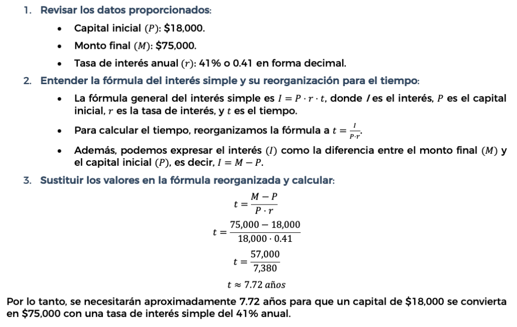 Para determinar el tiempo necesario para que un capital se convierta en un monto específico a una tasa de interés simple, utilizamos la fórmula del interés simple reorganizada para despejar el tiempo. Sigamos los pasos: