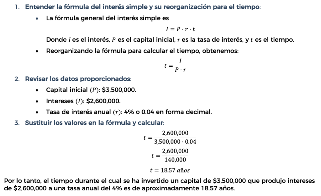 Para calcular el tiempo durante el cual se ha invertido un capital que ha generado una cierta cantidad de intereses a una tasa de interés simple, utilizamos la fórmula del interés simple reorganizada para despejar el tiempo. Veamos cómo se hace: