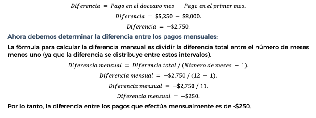 Se nos pide que identifiquemos la diferencia que hay entre los pagos mes con mes cuando el primer mes se paga 8,000 y el doceavo se paga 5,250, entonces tenemos los siguientes datos: