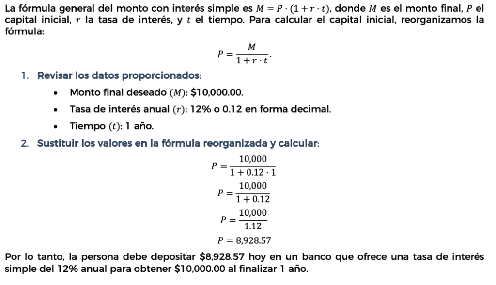 23. Si una persona desea obtener al finalizar 1 año el monto de $10,000.00, ¿qué cantidad debe depositar hoy en un banco que ofrece una tasa de interés simple de 12% anual?